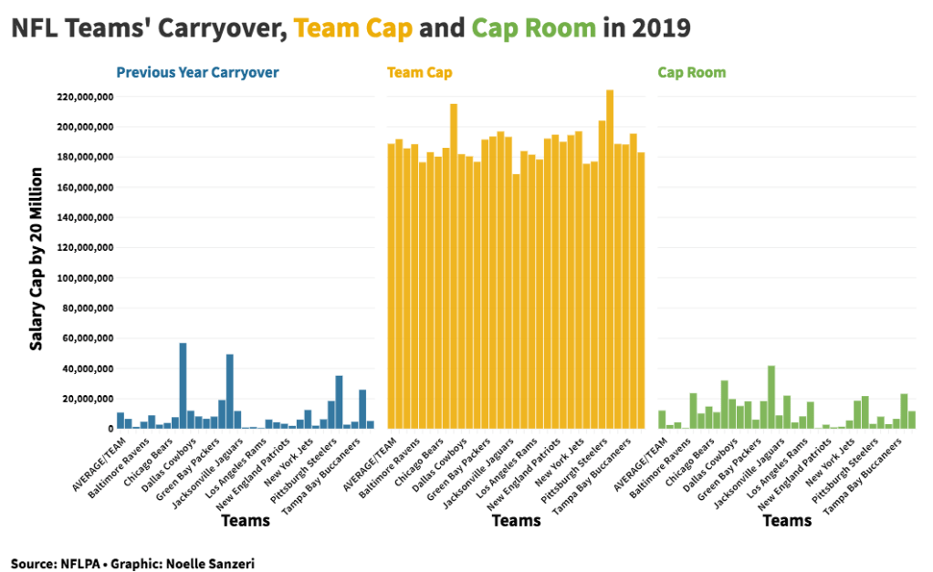 In all professional sports there is a salary cap. This is the amount of money teams are allotted to pay the players on the team. In 2019, the NFL raised the salary cap to $188.2 million, a 6.2% increase from 2018’s $177.2 million cap. Below is a chart comparing NFL team’s salary caps, as well as their carryover not spent from the previous year and cap room: